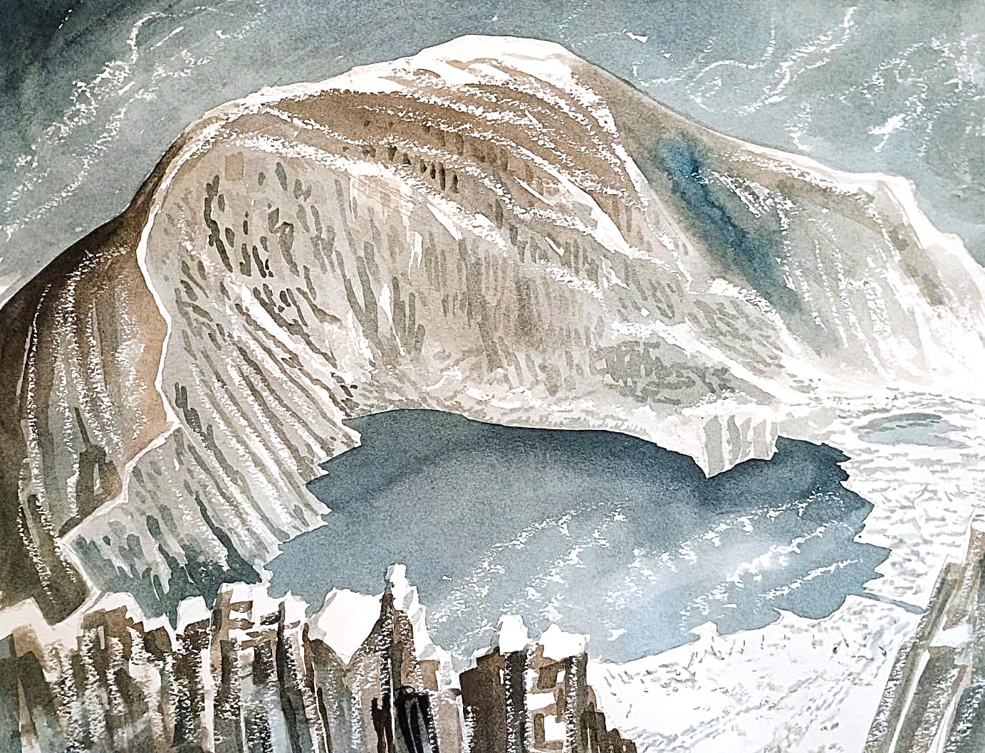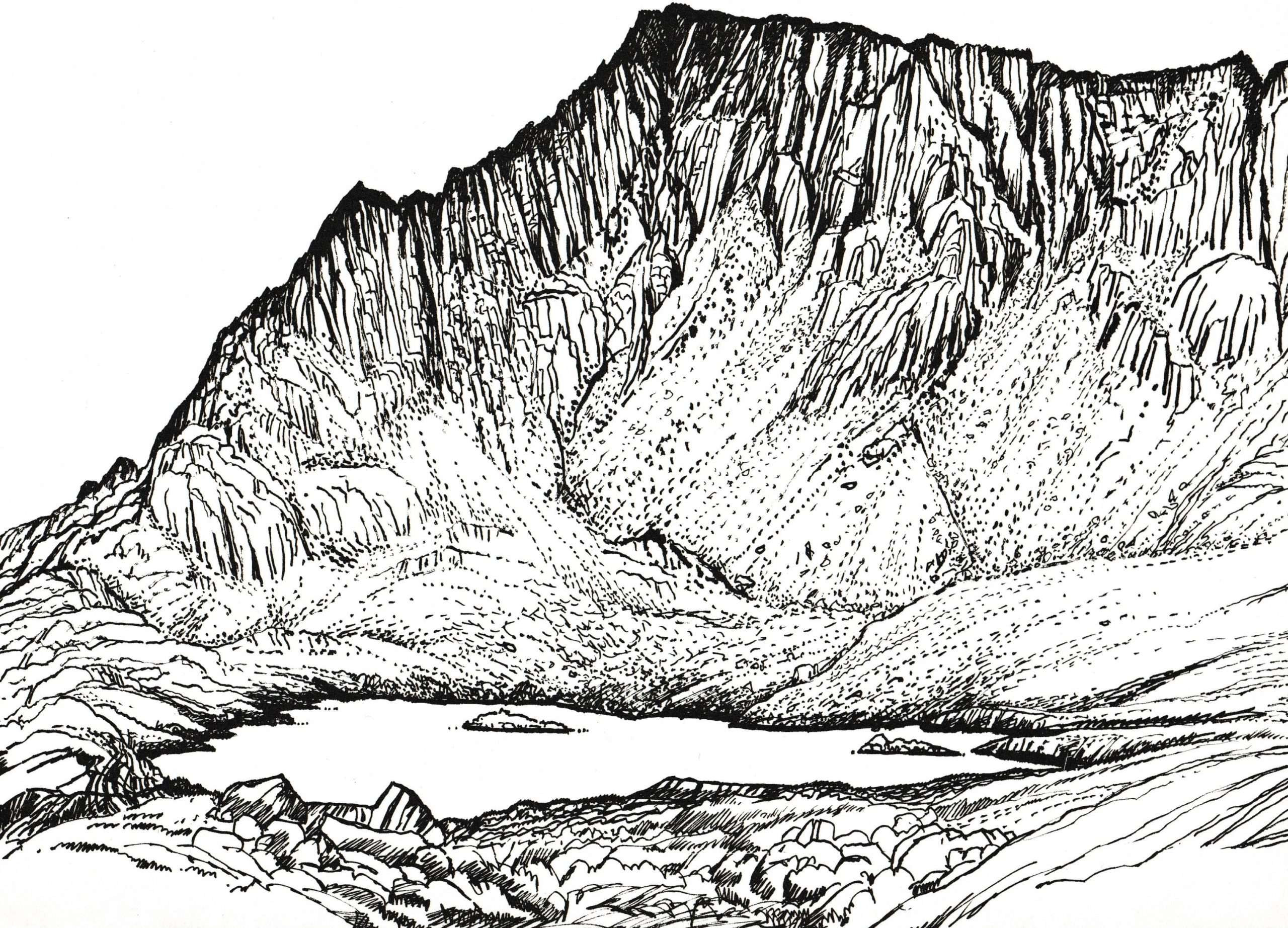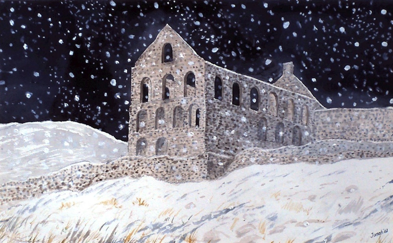 The cards have a wintry theme, making them suitable as Christmas cards but also at any time of the year. Comprising five watercolours and one pen and ink drawing, they are all images of Jonah’s North Wales heartland – including some of his typical sketches while out on his daily walks, usually in the company of his whippet.